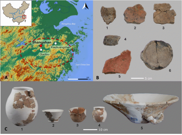 值得一提的是,在最新发现的桥头文化遗址中,科学家还找到了9000年前先民饮酒的证据。2021年4月,美国斯坦福大学、中国科学院地质与地球物理研究所、浙江省文物考古研究所3家单位共同合作,从上山遗址的陶器残片发现含有多种植物淀粉粒,存在发酵过程。此外,研究还发现了大量真菌成分,包括红曲霉和酵母细胞,由此证实了上山遗址存在稻米酒遗存。上山先民已使用陶器酿造以红曲霉为主要糖化剂的稻米曲酒。