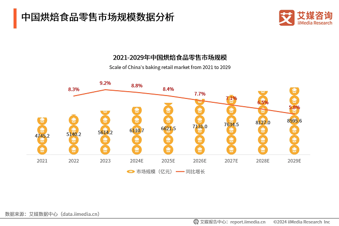 在健康消费升级与烘焙行业结构性变革的双重驱动下,全麦面包赛道近年来呈现出爆发式增长态势。iiMedia Research(艾媒咨询)数据显示,2024年中国烘焙食品零售市场规模已达到6110.7亿元,预计2025年中国烘焙食品零售市场规模达6621.5亿元,同比增长8.4%。伴随人均消费能力的提升与餐饮消费结构的优化,中国烘焙食品零售市场正迎来持续扩容的发展态势,预计到2029年可达8595.6亿元。